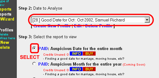 - Click on the Auspicious Date link, which opens up a Report Wizard on the right frame.